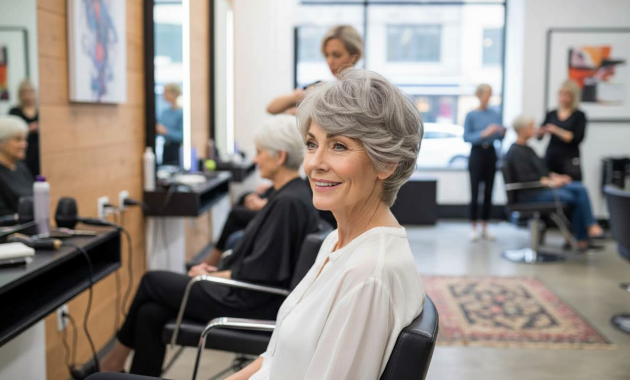The woman sitting in front of the salon mirror is 67. Silver roots peek through her grown-out bob as she