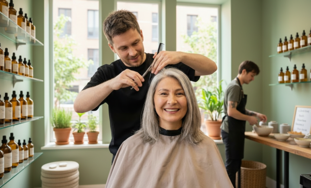 The woman sitting in front of the salon mirror is 67. Silver roots peek through her grown-out bob as she